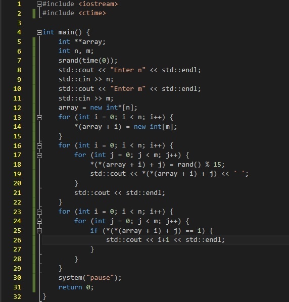 Дан целочисленный массив А[1..n, 1..m]. Определить номера тех строк массива, в которых есть хотя бы один элемент, равный 1.