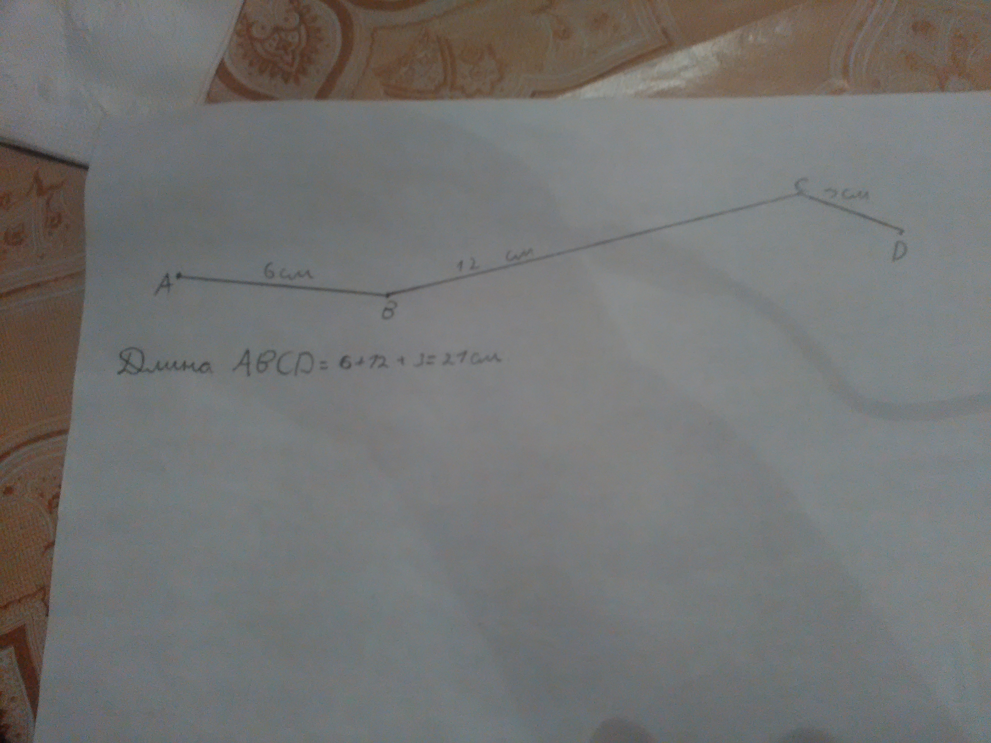длина одного звена 6см, другого 12см и третьего 3см. Длина ломаной ABCD 21см