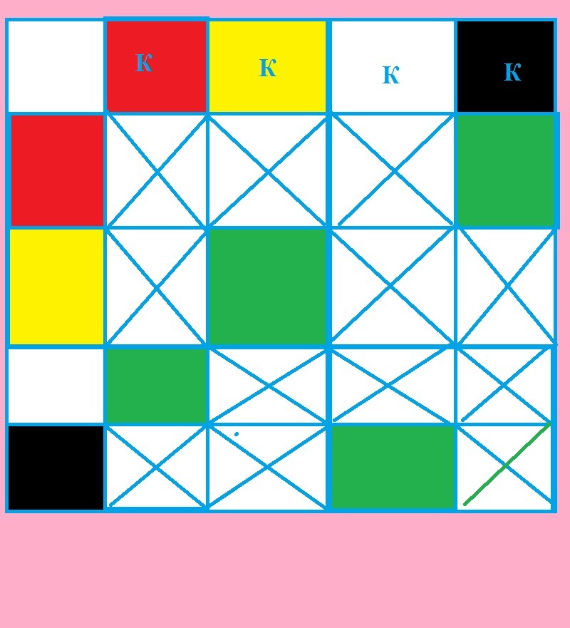 у мартышки имелись четыре коробки и четверо очков разных цветов :красные ,желтые,белые ,черные . Так случилось ,что примеряя очки ,Мартышка забыла ,в какой коробке какие очки находились .Известно ,что в белой коробке были очки противоположного цвета . В желтой коробке были очки такого же цвета .Цвет коробки и очков совпадал только в одном случае .Помогите нашей героине разложить очки по коробкам.Какие очки надо положить в КРАСНУЮ коробку ?