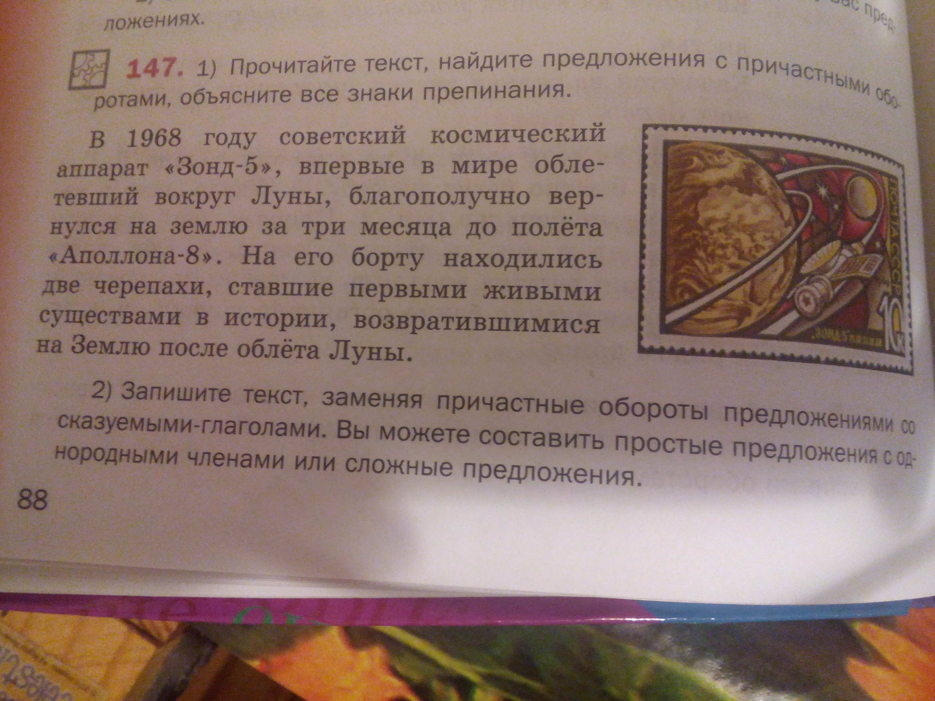 Впервые в мире облетевший вокруг луны заменяешь на-который впервые в мире облетел вокруг луны,а ставшие первыми живыми существами в истории,возвратившимися на Землю после облета луны,заменяешь на -которые стали первыми живыми существами в истории,и возвратились на землю после облета луны.Остальное переписываешь без изменений
