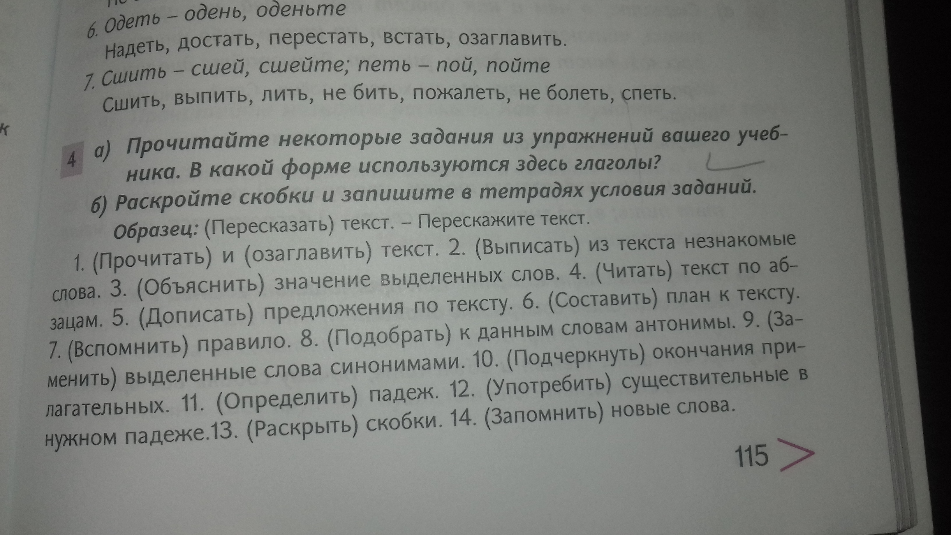 1. Прочитайте и озаглавьте текст. 2. Выпишите из текста незнакомые слова. 3. Объясните значение выделанных слов. 4. Читайте текст по абзацам. 5. Допишите предложения по тексту. 6. Составьте план по тексту. 7. Вспомните правило. 8. Подберите к данным словам антонимы. 9. Замените выделенные слова синонимами. 10. Подчеркните окончания прилагательных. 11. Определите падеж. 12. Употребите существительные в нужном падеже. 13. Раскройте скобки. 14. Запомните новые слова. | Помогла?- достаточно кнопки" Спасибо".