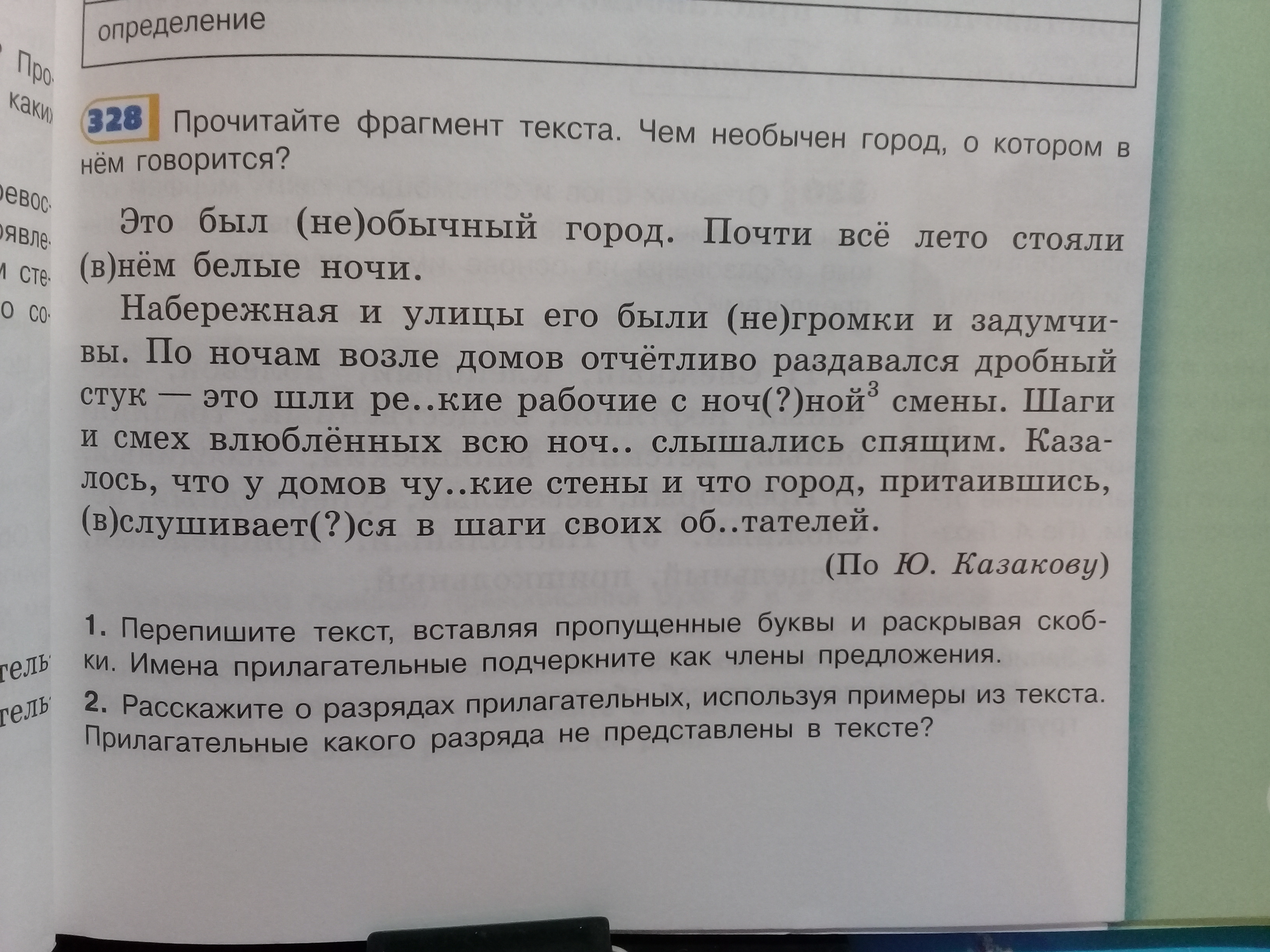 слушай: прилагательное отвечает на вопросы какой? какая? какие? и т.д.. Дам образец на 1 предложение в тексте: Это был (какой?) необычный город. Ну а дальше уже наверное поймёшь :)