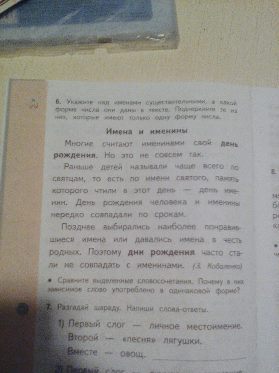 Многие считают именинами (мн.ч.,1 форма; употребляется только во мн. ч.) свой день (ед.ч.) рождения (ед.ч.,1 форма: употребляется только в ед. ч.). Но это не совсем так. Раньше детей (мн.ч.) называли чаще всего по святцам (мн.ч.,1 форма: употребляется только во мн. ч.), то есть по имени (ед.ч.) святого (ед. ч.), память (ед.ч.,1 форма: употребляется только в ед. ч.) которого чтили в этот день (ед.ч.) --- день (ед.ч.) именин (мн.ч.,1 форма: употребляется только во мн. ч.). День (ед.ч.) рождения (ед.ч.,1 форма: употребляется только в ед. ч.) человека (ед.ч.) и именины (мн.ч.,1 форма: употребляется только во мн.ч.) нередко совпадали по срокам (мн.ч.).