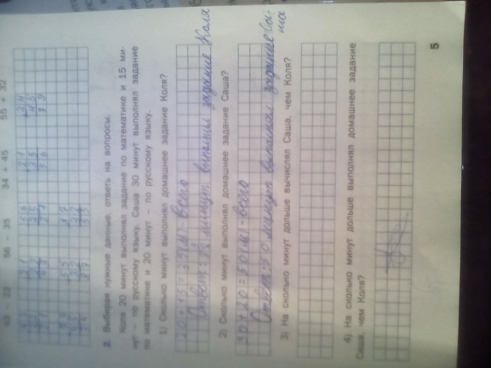 в четвёртой части надо из 50 вычесть 35 ( сколько делал всё домашнее задание Саша и сколько Коля) получаем 15 (разница во времени по всему домашнему заданию у Саши с Колей)