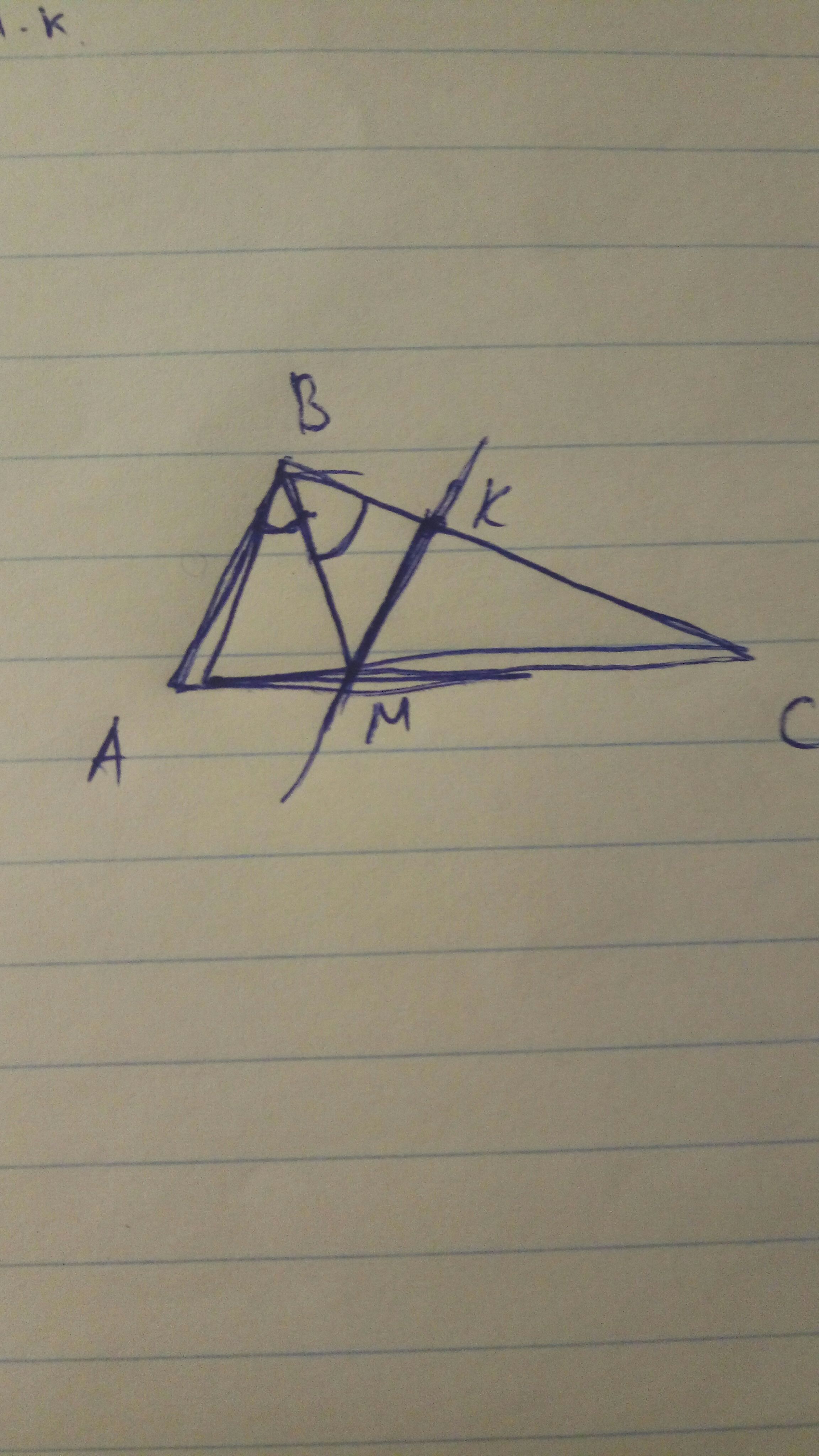 Биссектр. Делит угол пополам, значит углы при вершине В равны. Угол ВМК и угол МВК равны т.к. Накрест лежащие. Значит угол ВМК = 180 - 94/2*2 = 86