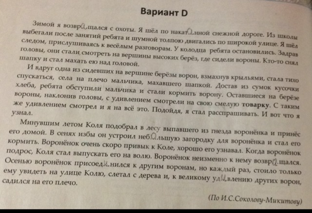 Минувшим лето Коля подобрал в лесу воронёнка , принёс домой , сделал ему загородку в сенях и начал его кормить.Когда воронёнок привык к мальчик , он стал выпускать его .Воронёнок присоединился к другим воронам но к их удивлению он часто прилетал к коле на плечо.Не сильно длинно?