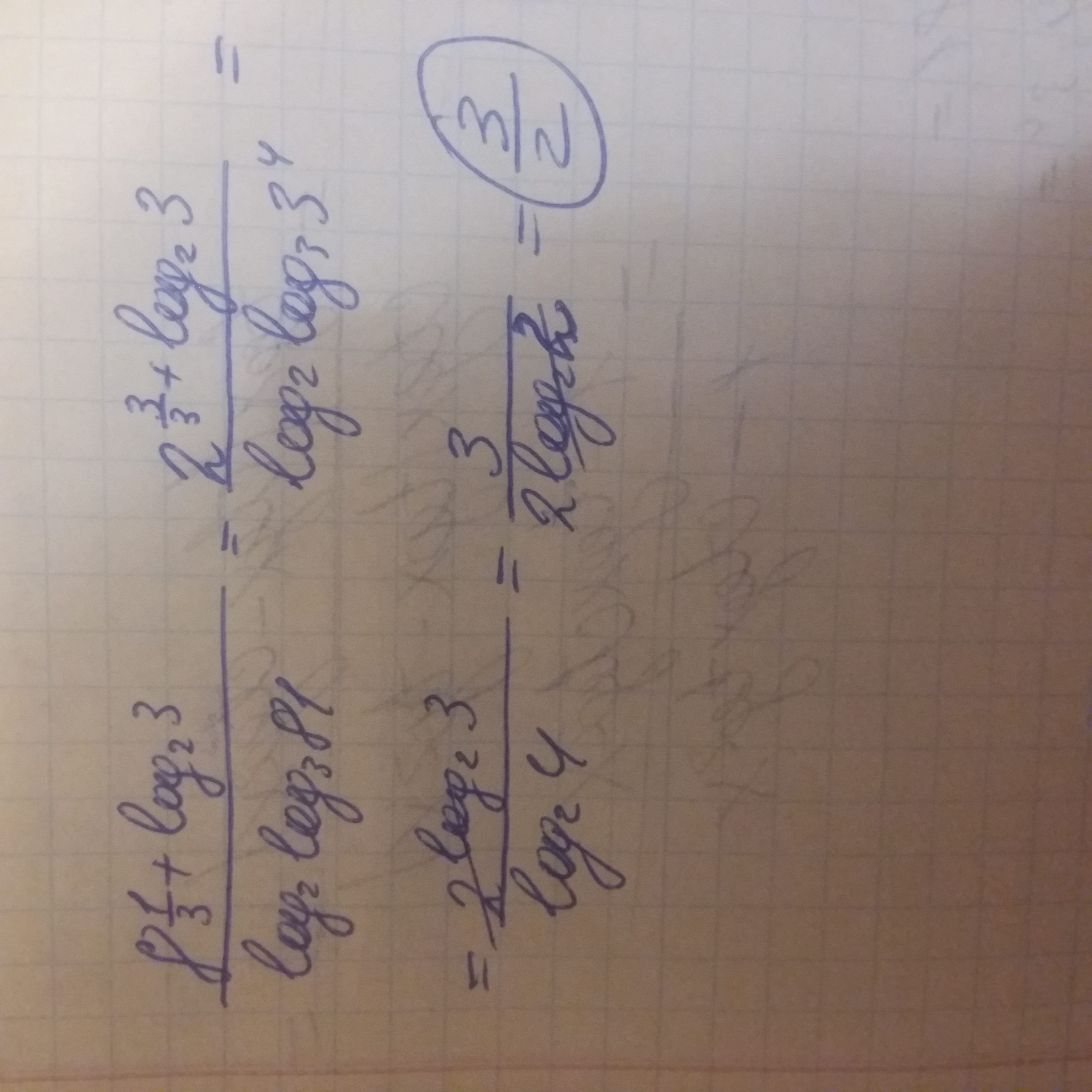 Помогите вычислить (8^1/3+log с основанием 2 числа 3) : log с основанием 2 log с основанием 3 числа 81. Напишите какие св-ва использовали.