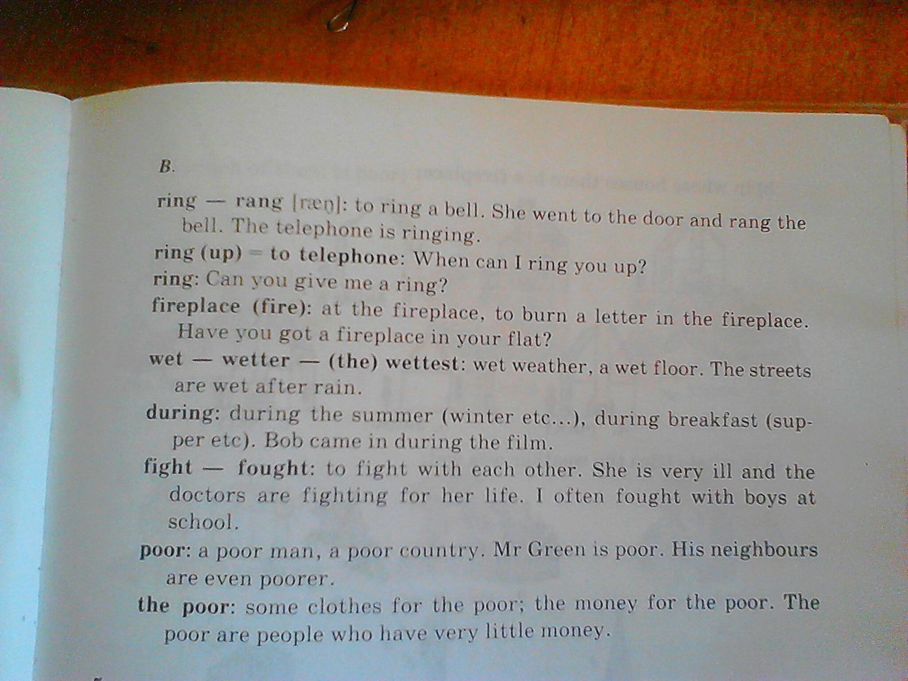 кольцо позвонил lrenl: чтобы позвонить в звонок. Она подошла к двери и позвонил. Телефон звонит. кольцо (вверх) на телефон: Когда я могу позвонить вас? кольцо: Можете ли вы дать мне кольцо? камин (огонь): у камина, чтобы сжечь письмо в камин У вас есть камин в вашей квартире? влажная влажнее и дождливый: влажная погода, мокрый пол. Улицы мокрые после дождя. во время:. в летнее время (зима и т.п ... во время завтрака (за под- и т.д.) Боб пришел во время боя фильма боролись:., чтобы бороться друг с другом, она очень больна, и врачи борются за ее жизнь я часто. . дрался с мальчиками в школе бедных: бедный человек, бедная страна, г-н Грин бедных Его соседи еще беднее бедных:.. кое-какую одежду для бедных, деньги для бедных бедные люди, которые имеют очень мало денег