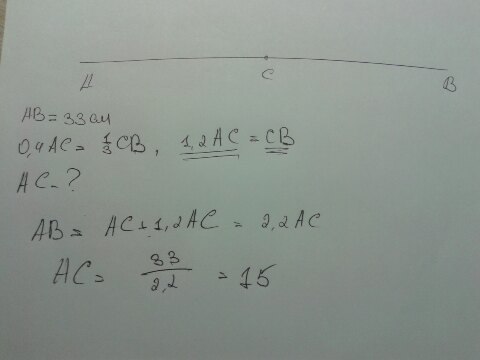 Ребят, я ученица 6-го класса не могу решить задачку уравнением! Помогите даю 20 баллов!! Длина отрезка АВ 33 см. Точка С делит его на два отрезка АС и СВ. 40% отрезка АС равны 1/3 отрезка СВ. Найдите длину отрезка АС.