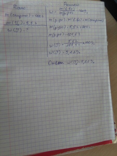 В спирте массой 100г растворили 5,5г йода . Рассчитайте массовую долю йода в полученном растворе