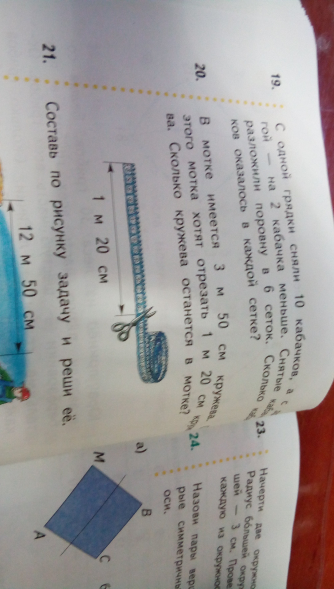 В мотке имеется 3м 50см кружева. От этого мотка хотят отрезать 1м 20см кружева. Сколько кружева останется в мотке? номер 20