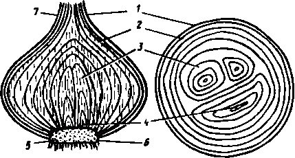 1 — сухая покровная чешуя; 2 — открытые сочные чешуи; 3 — закрытые сочные чешуи; 4 — зачатки; 5 — донце; б — пятка; 7 — шейка