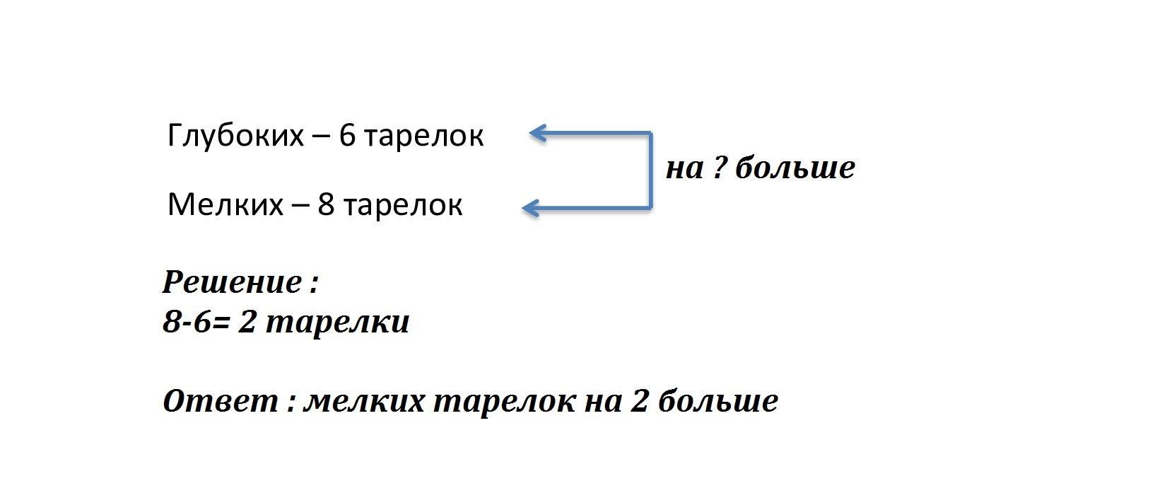 На столе стояло 6 глубоких тарелок и 8 мелких.На сколько больше было мелких тарелок,чем глубоких? Помоги пожалуйста как писать условие задачи?