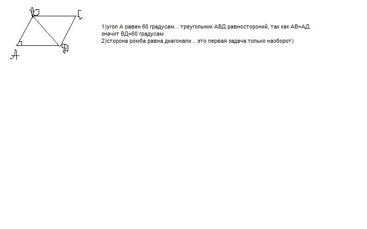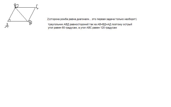 №2.Стороны ромба равна одной из его диагоналей. Найдите величину угла ромба.