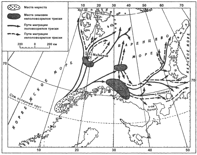 Нерестовые миграции – массовое передвижение рыб к местам нереста. Треска зимой и весной уходит к берегам Норвегии на нерест. Треска идет на нерест к Лофонтенским островам. Морская камбала идет на нерест от берегов на глубину.
