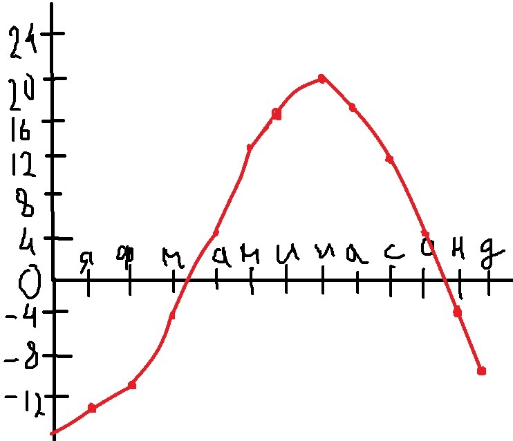 построить график годового хода среднемесячных температур по данным таблицы я -13 ф-11 м -5 а +4 м +12 и +16 и+20 а+18 с +11 о +4 н -4 д -10