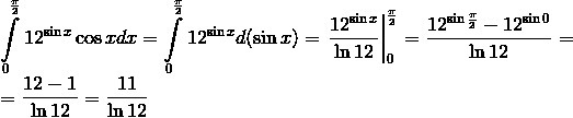 intlimits_0^{fracpi2}12^{sin x}cos xdx=intlimits_0^{fracpi2}12^{sin x}d(sin x)=left.frac{12^{sin x}}{ln12}right|_0^{fracpi2}=frac{12^{sinfracpi2}-12^{sin0}}{ln12}=\=frac{12-1}{ln12}=frac{11}{ln12}