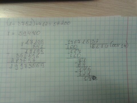 Решите (Х-3752)+482=56200 потом решите 87899•341 и ещё решите 176785:32 два последних примера надо решить столбиком