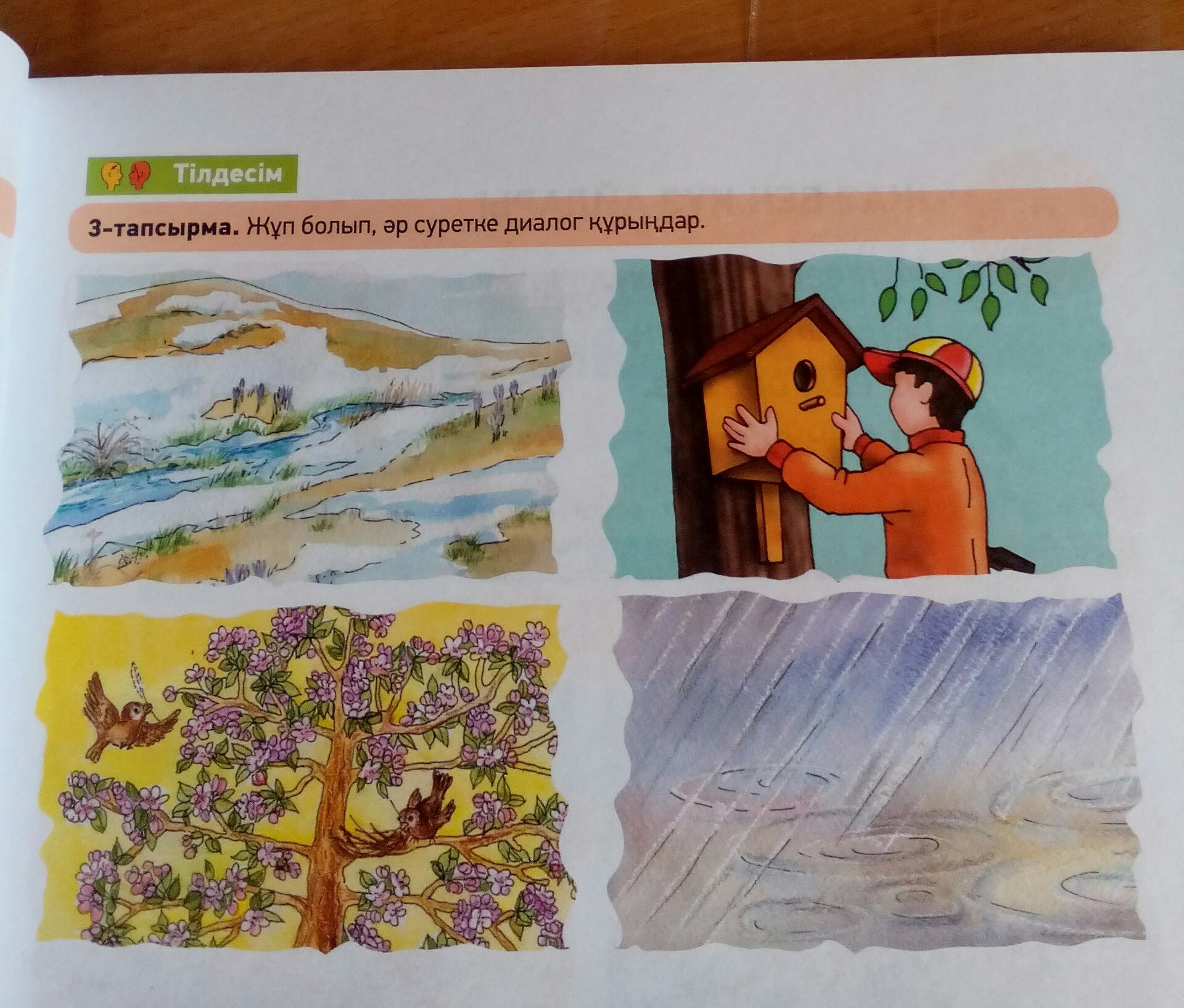 Міне, қыс кетіп көктем айы келеді. Көктем айында кұстар келіп көктем айын тамашалайды. Балалар құстарға ұя жасап талға іліп кояды. Бірте бірте жапырактар, гүлдер ашылып бастайды. Көктем айында жер шылкып лай батпақ болып жатады