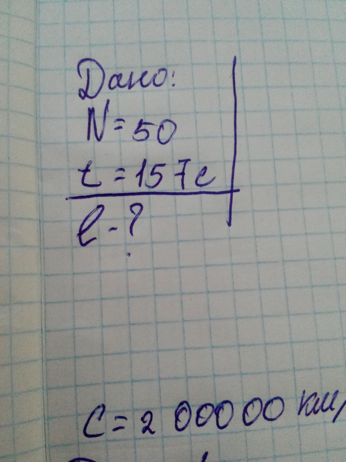 L=(t/(2*π*N))²*g=(157/(2*3.14*50))²*10=2.5 м