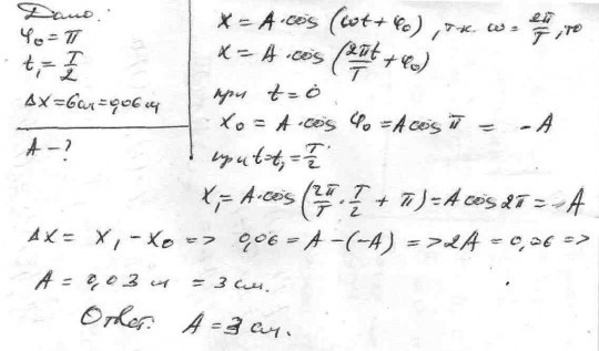 груз на пружине за Т/2 смещается на 6 см. С какой амплитудой колеблется груз? Начальная фаза колебаний равна- п рад.