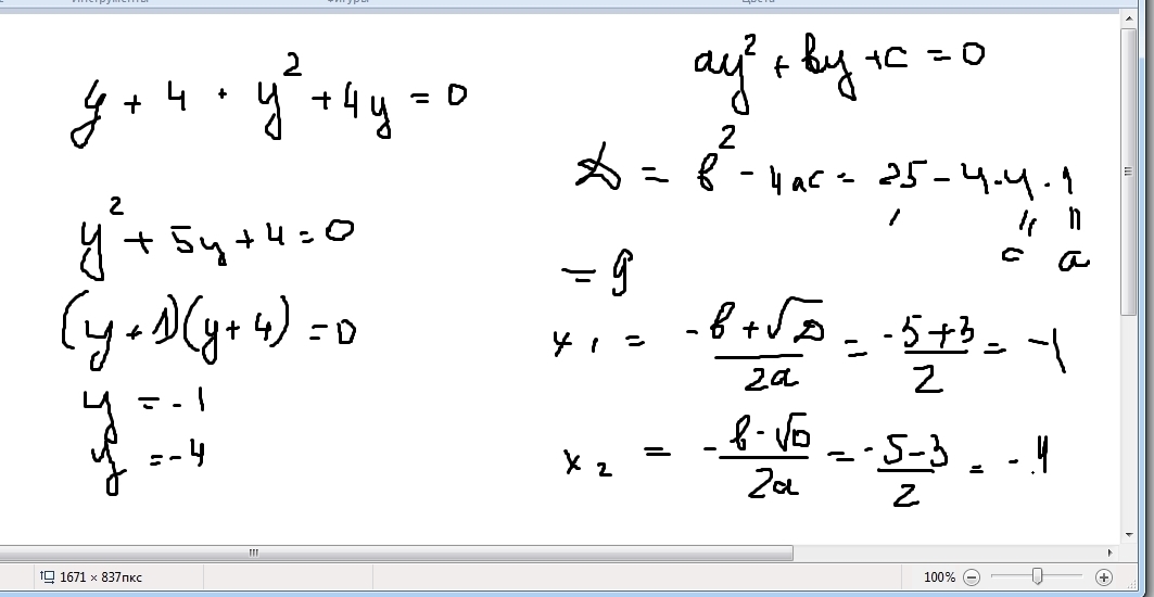 Дискриминант, корень 1 (х1), корень 2 (х2)
