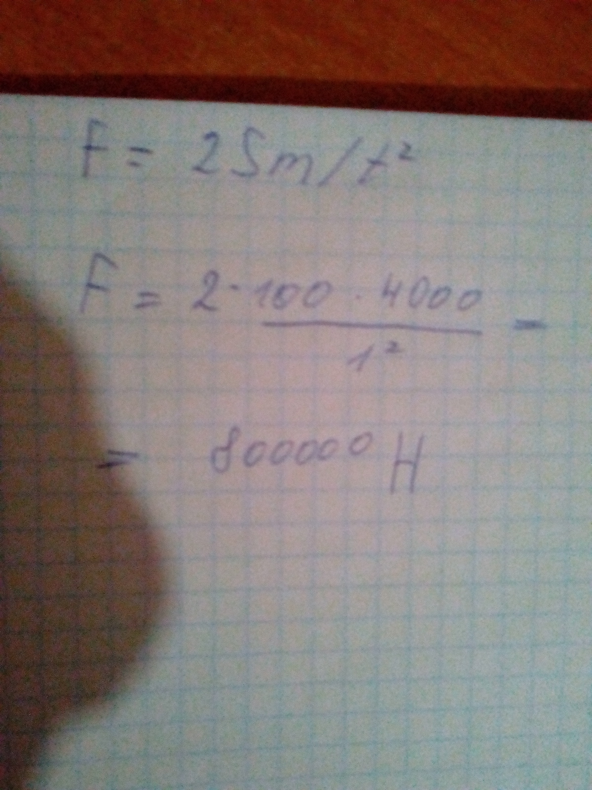 По формуле F=2Sm/t^2 найти силу тяги F, если автомобиль массой m=4000кг, трогаясь с места, прошел путь S=100м за 1 сек.