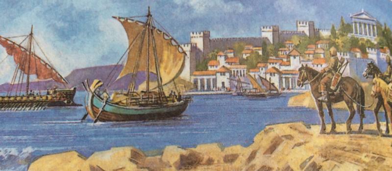 страница 152 опишите рисунок греческую колонию в Причерноморье. Предположите, какие товары купцы привезли.Какие закупят