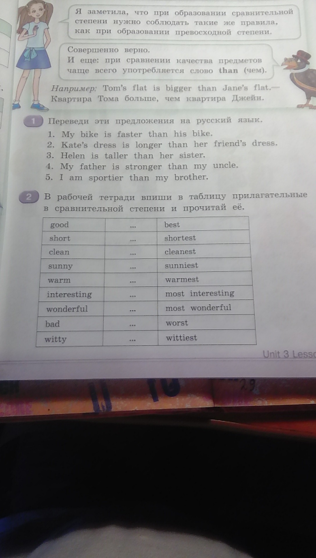 мой мотоцикл быстрее его мотоцикла. Катино платье длиннее платья её друга. Хелен выше её сестры. мой папа сильнее моего дяди. Я спортивнее моего брата. 2) better, sportier, cleaner, suner, warmer, -, -, -, witter