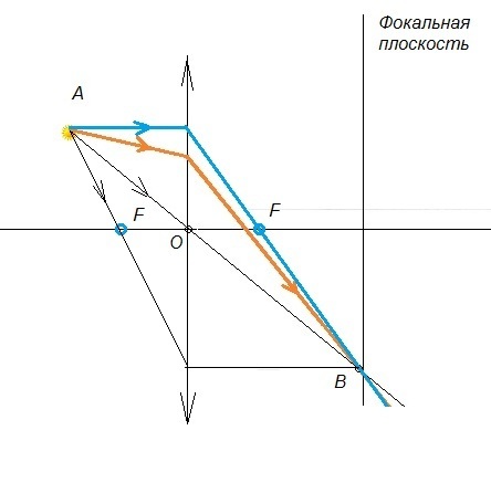 Луч, идущий параллельно проходит через фокус линзы и попадает в точку В.