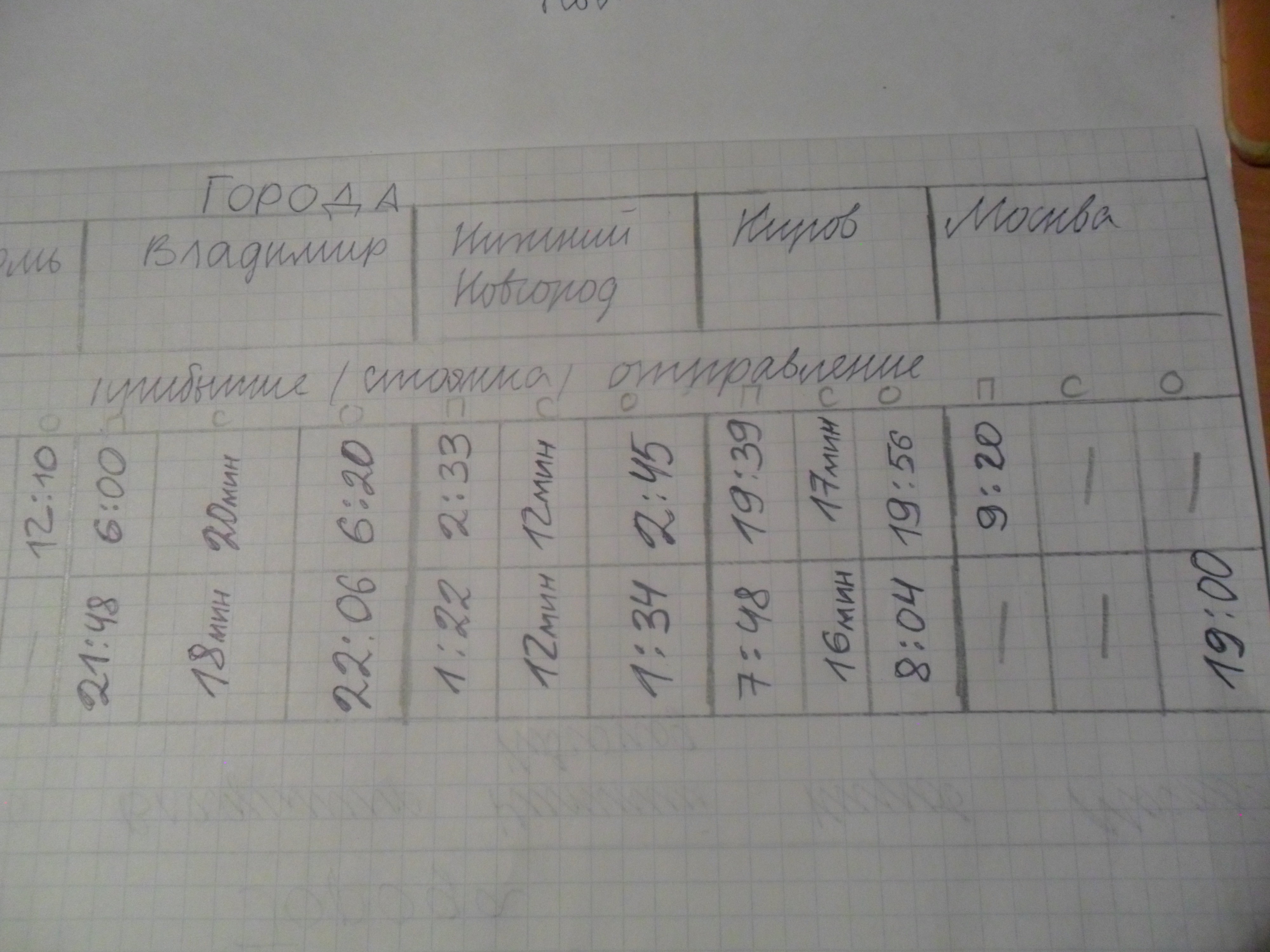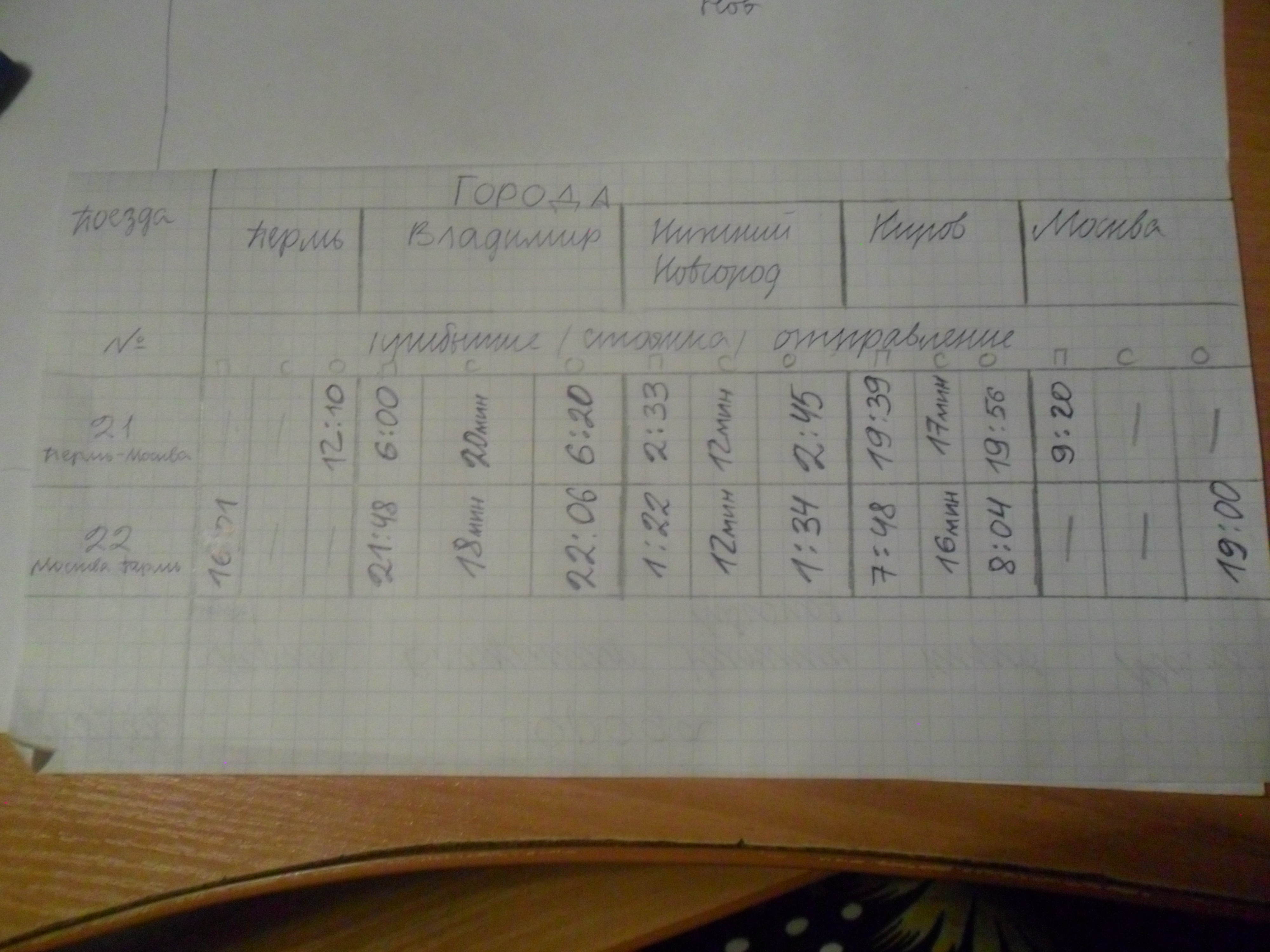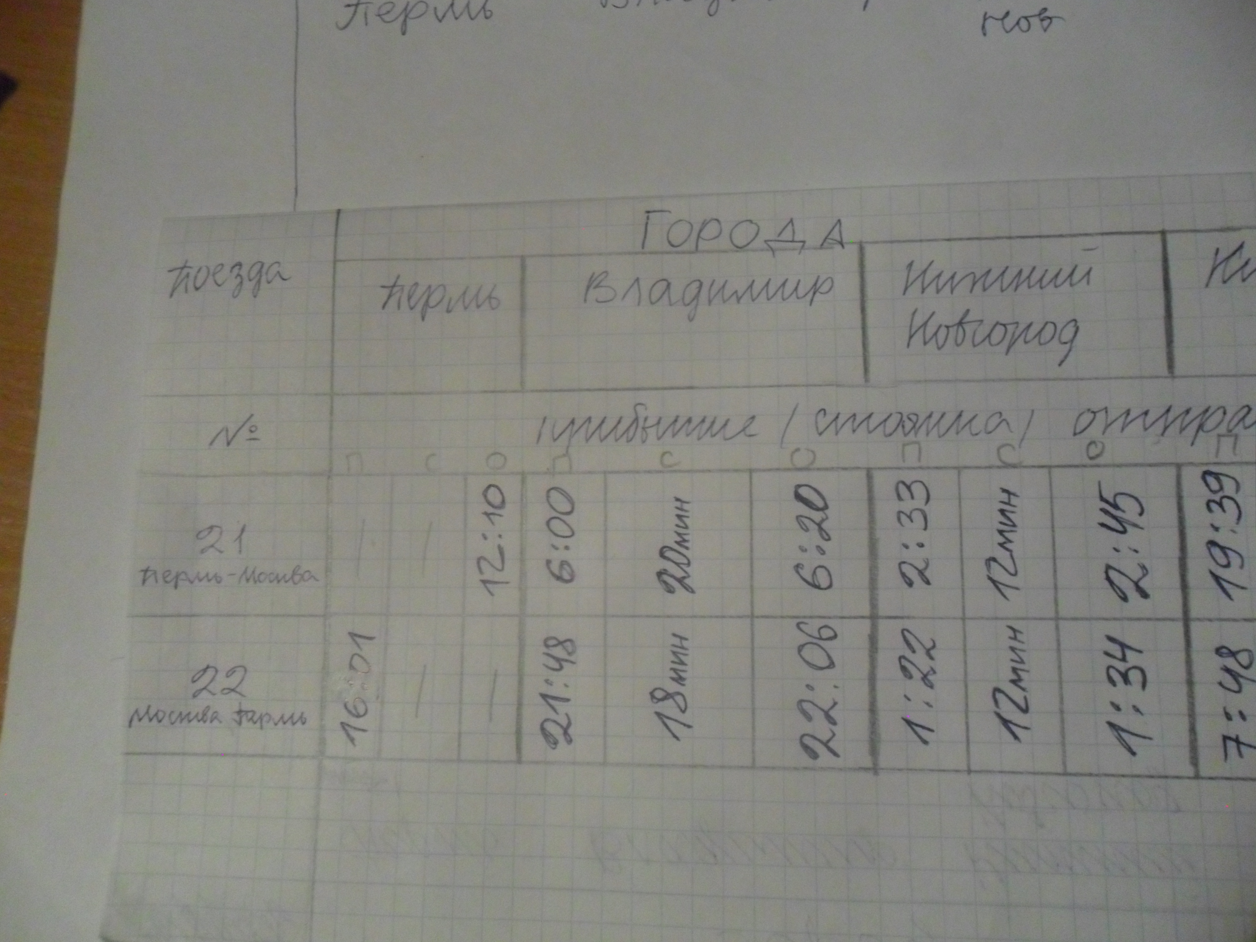 Время отправления поезда №21 из Перми – 12.10. Время отправления поезда №22 из Владимира – 22.06. Время прибытия поезда №22 в Нижний Новгород – 1.22. Время стоянки поезда №22 в Нижнем Новгороде – 12 мин. Время отправления поезда №21 из Кирова – 19.56. Время стоянки поезда №21 в Кирове – 17 мин. Время стоянки поезда №21 во Владимире – 20 мин. Время отправления поезда №22 из Кирова – 8.04. Время прибытия поезда №21 в Нижний Новгород – 2.33. Время отправления поезда №22 из Москвы – 19.00. Время прибытия поезда №21 во Владимир – 6.00. Время прибытия поезда №21 в Киров – 19.39. Время стоянки поезда №21 в Нижнем Новгороде – 12 мин. Время отправления поезда №21 из Владимира – 6.20. Время отправления поезда №21 из Нижнего Новгорода – 2.45. Время прибытия поезда №22 во Владимир – 21.48. Время прибытия поезда №22 в Киров – 7.48. Время отправления поезда №22 из Нижнего Новгорода – 1.34. Время стоянки поезда №22 во Владимире – 18 мин. Время прибытия поезда №21 в Москву – 9.20. Время стоянки поезда №22 в Кирове – 16 мин. Время прибытия поезда №22 в Пермь – 16.01.