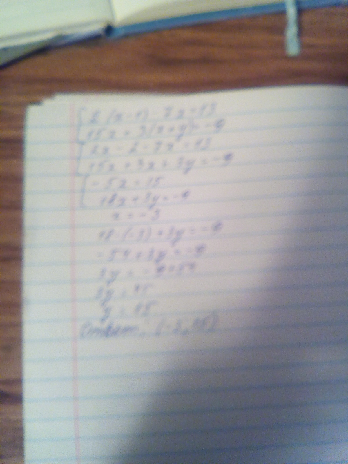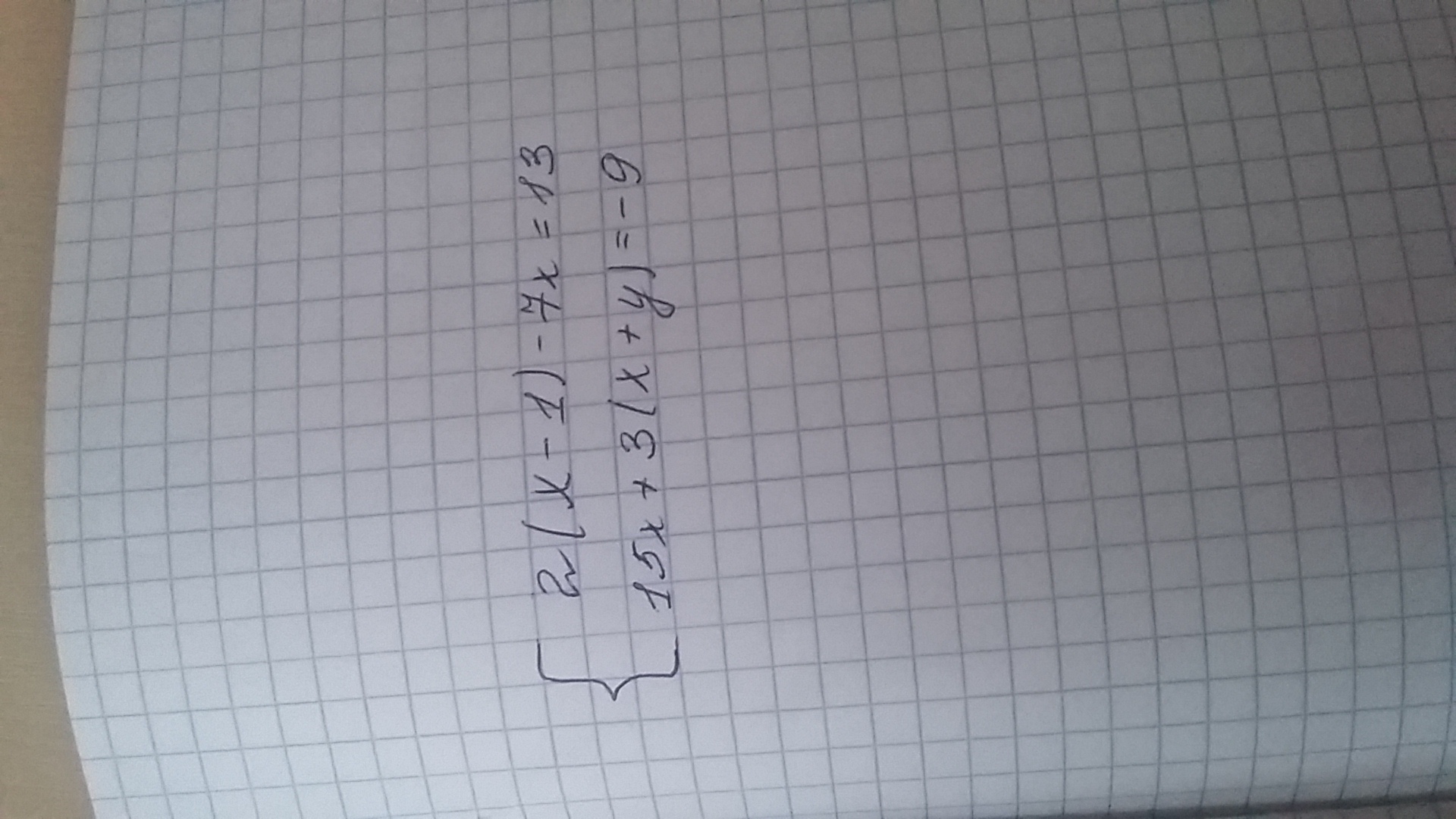 2х-2-7х=13;15х+3х+3у=-9;-5х=15;18х+3у=-9;х=-3;у=15