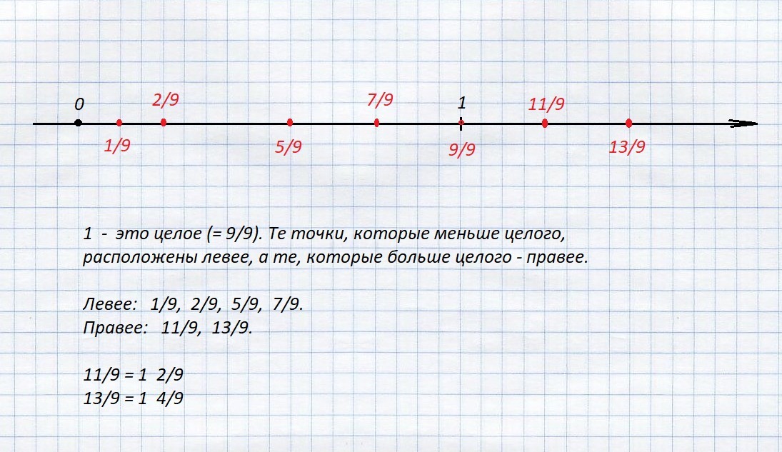 Начертите координатную прямую с единичным отрезком, равным 9см. Отметьте точки с координатами 1/9, 2/9, 5/9, 7/9, 9/9, 11/9, 13/9. Какие точки расположены левее 1, а какие—правее 1?