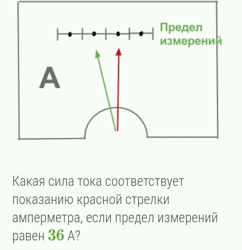 Какая сила тока соответствует показанию красной стрелки амперметра, если предел измерений равен 36 А?