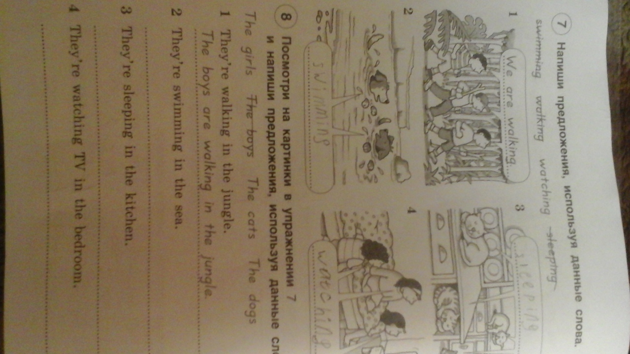 надо вместо слова они (they are) поставить слова , которые даны в начале упражнения по смыслу картинок : девочки смотрят телевизор, кошки спят на кухе, собаки плавают в море
