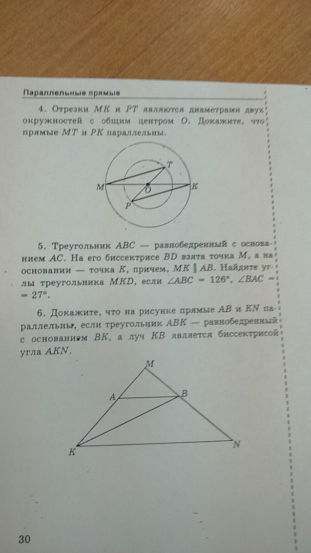 4. Точка О это середины МК и РТ(по условию), то треугольники МТО РОК равнобедренные. Тк они равнобедренные, то углы при основания равны. МТО=РОК(по углам(МОТ=РОК- это углы) и двум сторонам ОТ=ОР и МО=ОК). Если предположить, что МК и РТ секущии, то углы ТМК и МКР равны, следовательно МТ параллельно РК(я не помню какой это признак)