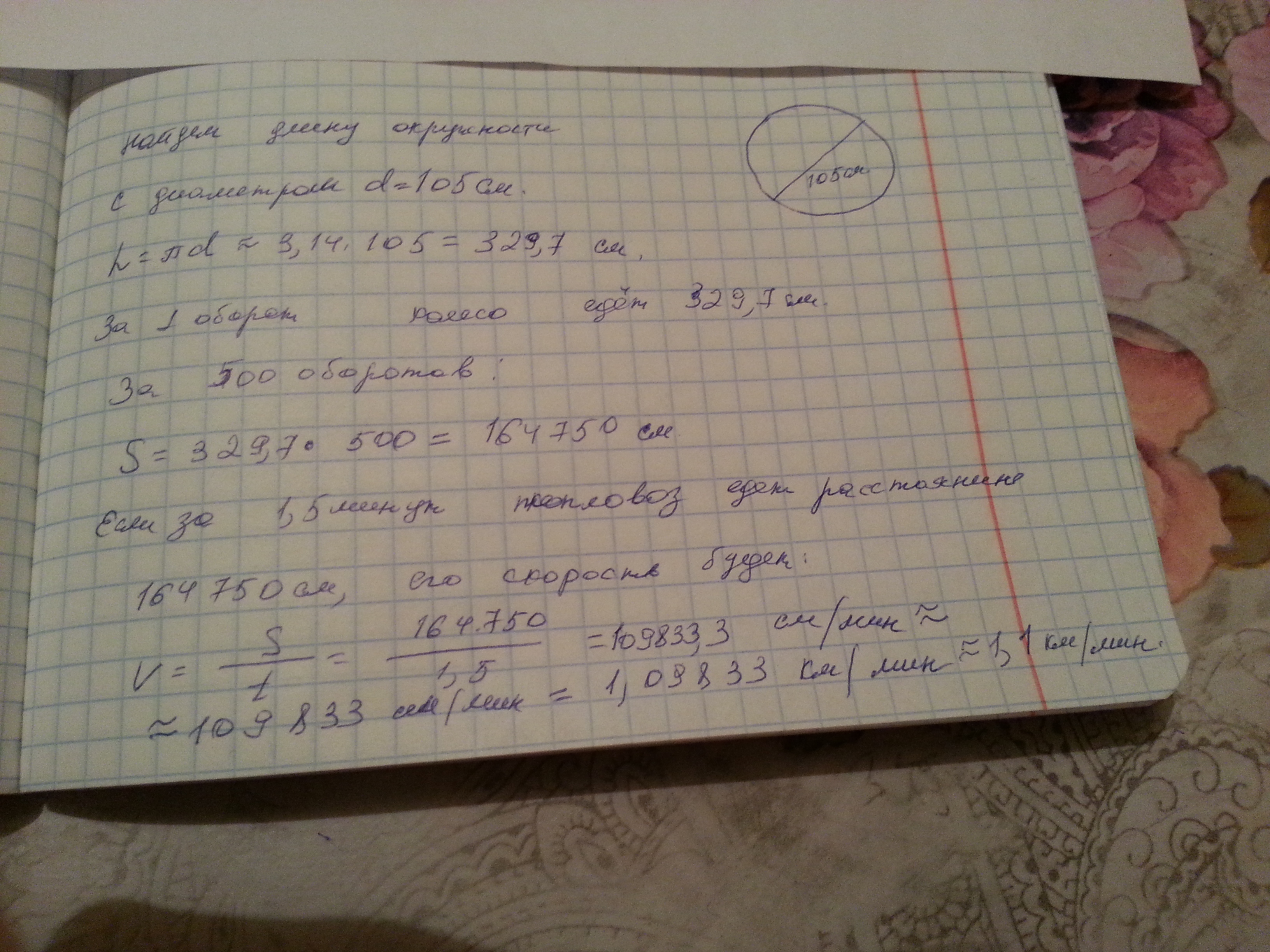 Диаметр колеса равен 105 см. За 1,5 мин колесо сделало 500 оборотов. С какой скоростью идёт тепловоз?