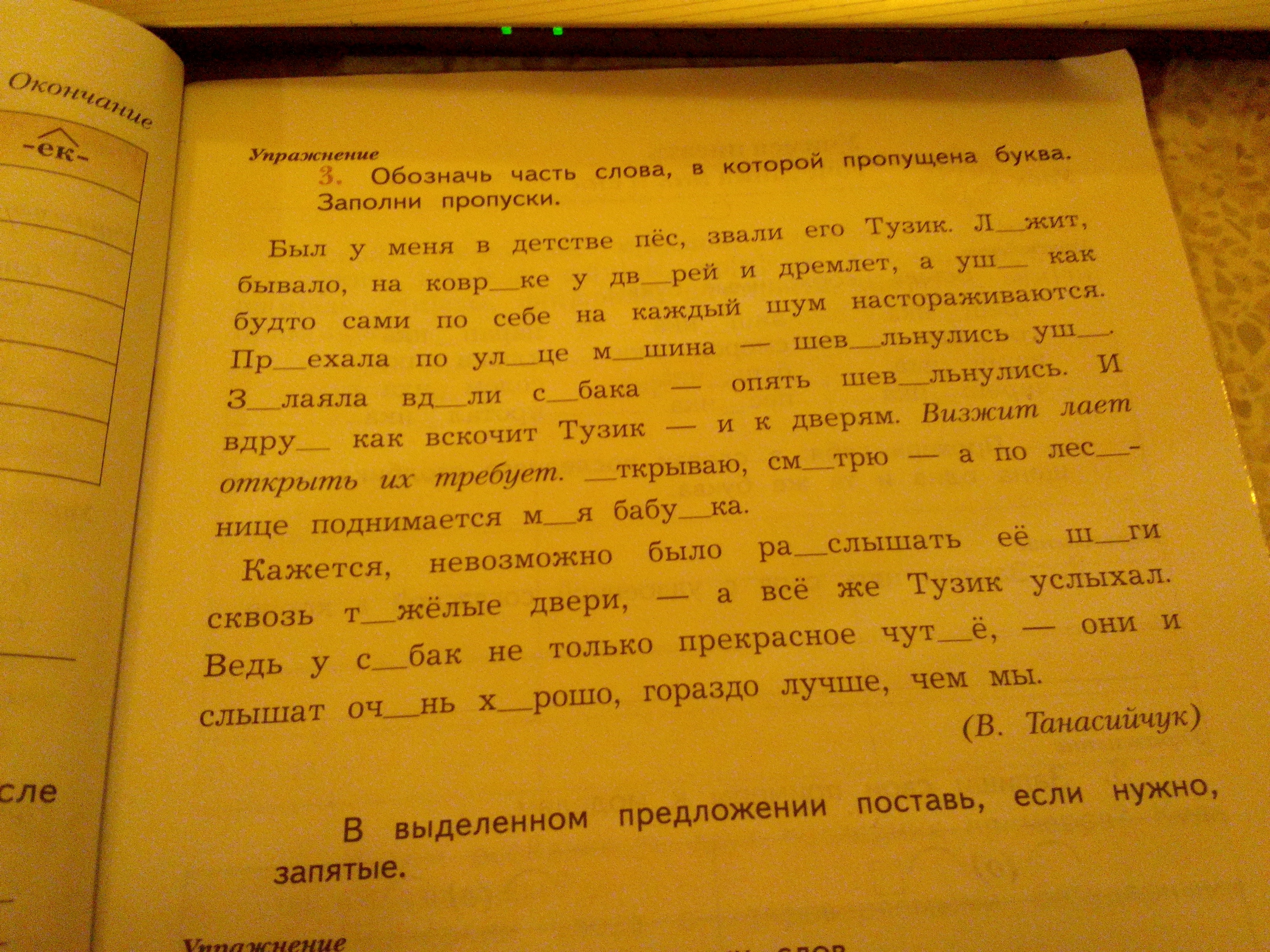 Лежит (корень), на коврике (суффикс), у дверей (корень), уши (окончание), проехала (приставка),по улице(корень), машина(корень), шевельнулись(корень), уши(окончание), залаяла (приставка), вдали (корень), собака (корень), шевельнулись (корень), вдруг (корень), открываю (приставка) , смотрю( корень), лестнице(корень), моя (корень), бабушка(суффикс), расслышать (приставка), шаги (корень), тяжелые (корень), собак (корень), чутьё (корень), очень (корень), хорошо(корень)
