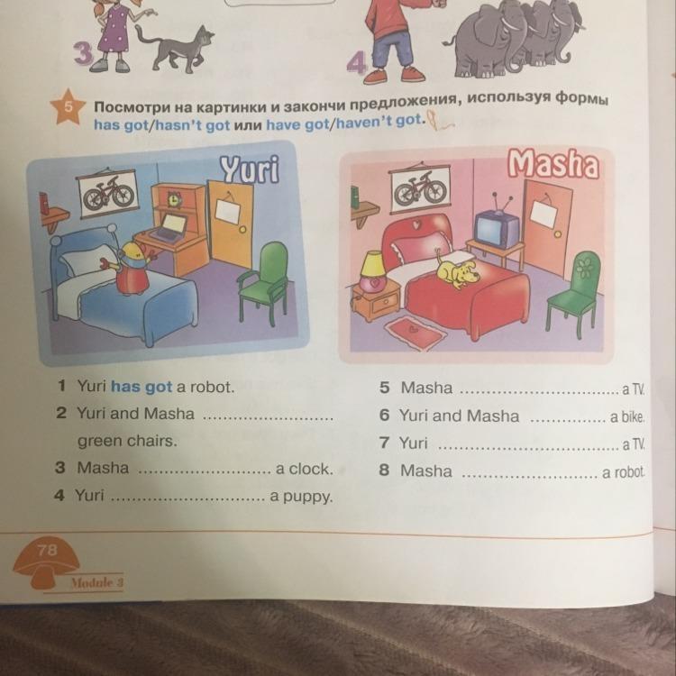 Посмотри на картинки и закончи предложения, исползуя формы has got/hasnog't bkb haven't got. 1/Yuri has got a robot.2 Yuri and Masha....green chais. 3 Masha.....a clock. 4Yuri....a puppy. 5 Masha .....a TV.6 Yuri and Masha a bike.7 Yuri.... a TV. 8 Masha ....a robot