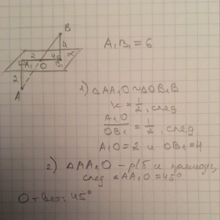 Помогите, пожалуйста!!!!!!!!!!! Отрезок АВ пересекает плоскость а. Его концы отстают от плоскости на расстоянии 2 и 4 см. Найдите угол между отрезком и плоскостью если известно что проекция отрезка на плоскость а равна 6.