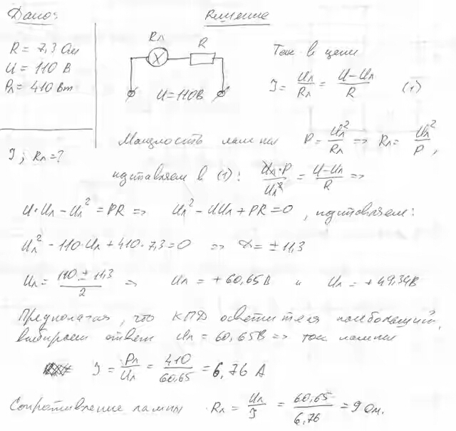 Дуговая лампа включена последовательно с сопративленим 7,3 Ом в сеть с напряжением 110 В. Потребляемая лампой мощность составляет 410 Вт . Опредилить силу тока в лампе и ее сопративление в режиме горения