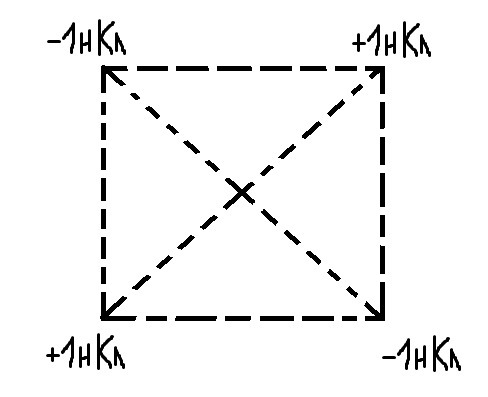 Если же у одного из зарядов поменять знак, то 2 соседних заряда будут компенсировать друг друга, а противоположный заряд усиливать поле.