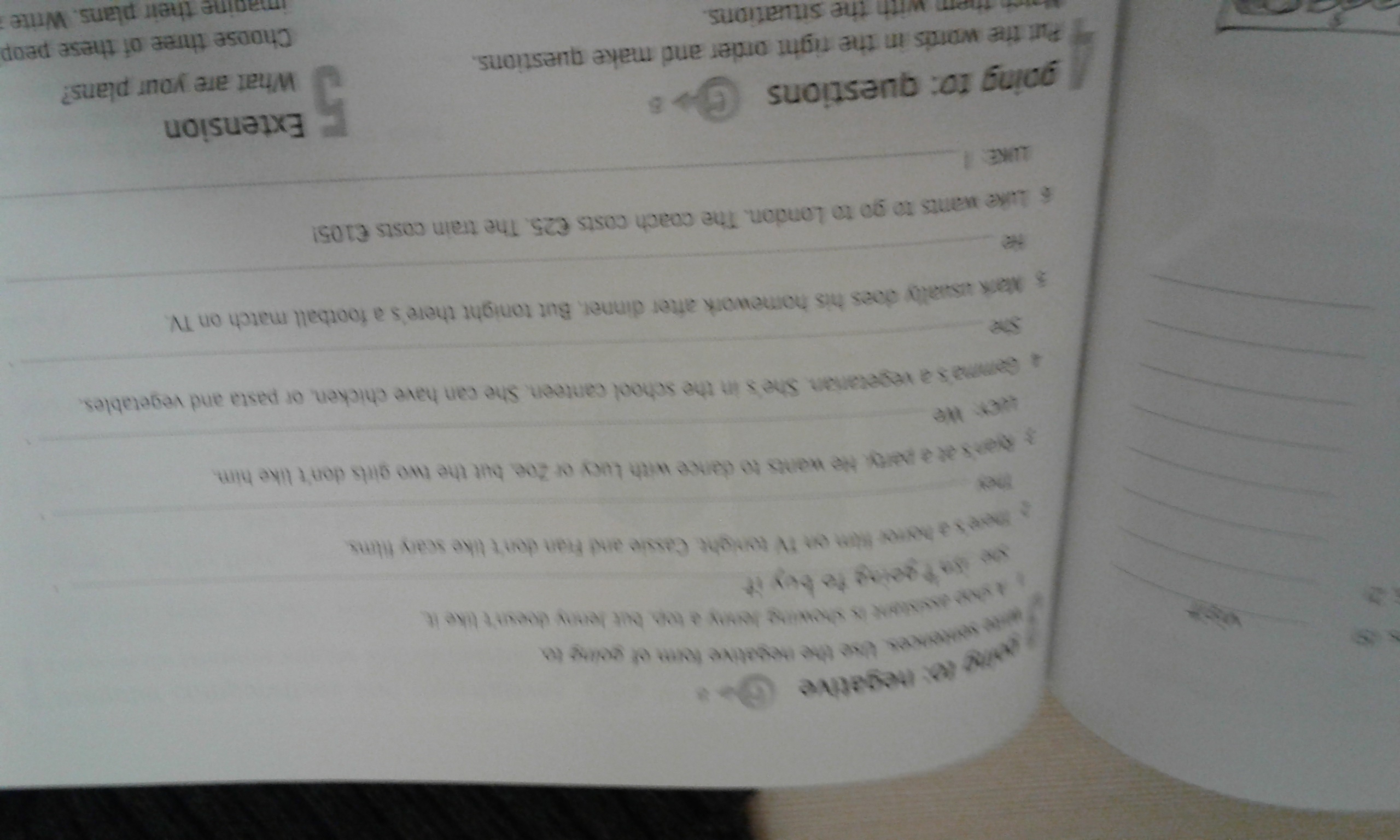 2 They are not going to watch a horror film on TV tonight3 we're not going to dance with Ryan4 She's not going to have chicken5 he's not going to do his homework after dinner6 I'm not going to pay 105 euros for the train ticket