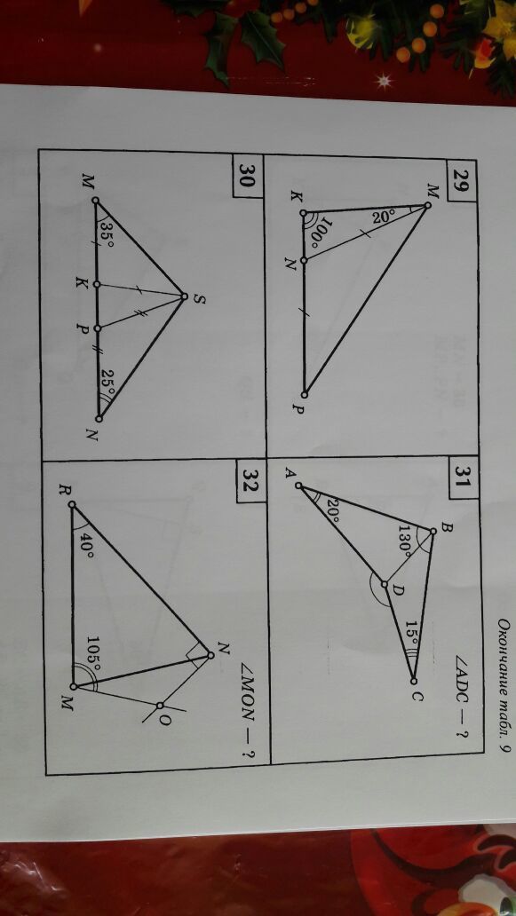 30.треугольник МКС равнобедренный,значит углы при основании равны.угол МКС=180-2*35=110,значит угол СКР=180-110=70 градусов,треугольникСРН равнобедренный,угол СРН=180-2*25=130,значит угол СРК=180-130=50.ИЩЕМ УГОЛ КСР=180-50-7=60 ГРАДУСОВ