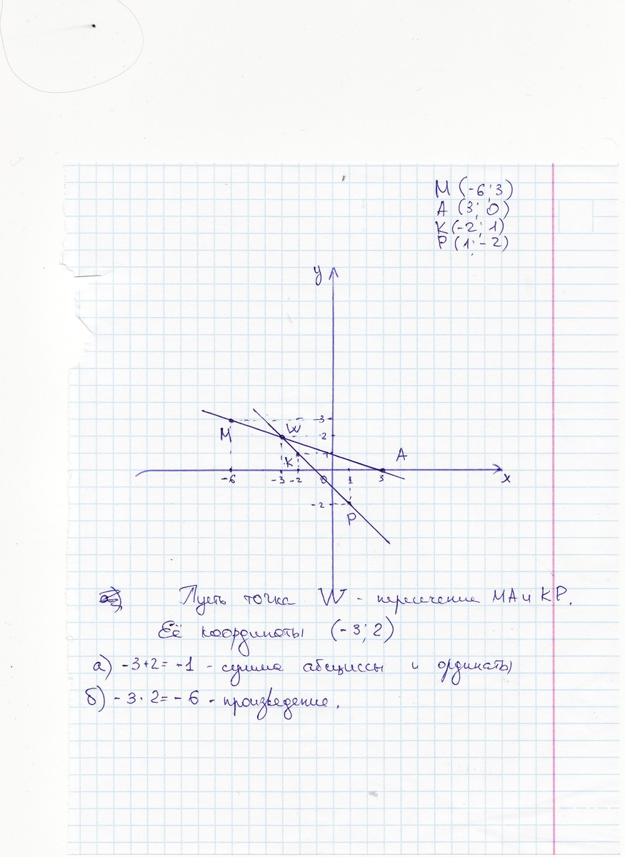 Отметьте в координатной плоскости точки М (-6;3), А (3;0), К (-2;1), Р (1;-2). Проведите прямые МА и КР.Найдите координаты точки пересечения.Укажите: