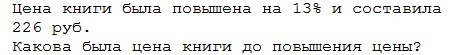 Чтобы найти сколько стоила книга до повышения цены, нужно найти 13%, надо 226 умножить на 13 и разделить на 100 получится 29,38. Теперь из 226 рублей вычитаем 29,38 будет 196,62
