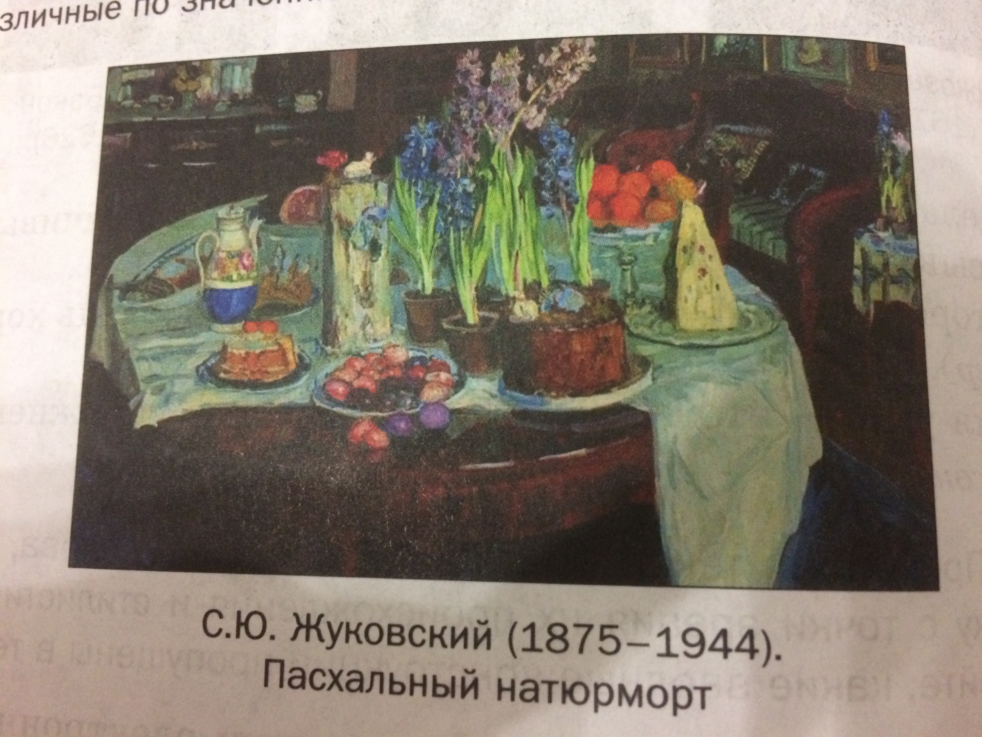 Передо мной картина С.Ю. Жуковского, названная художником "Пасхальный натюрморт". На переднем плане располагается стол с небрежно спускающейся скатертью, в центре которого стоят цветы в горшочках. Моё внимание привлекают яркие фрукты в вазе, цветистый чайничек и окрашенный яйца, которые невозможно не заметить. В комнате довольно темно, но чувствуются едва проникающие лучи солнца, скорее всего художник изобразил раннее утро. На столе можно заметить творожную пасху, кулич и прочие традиционные блюда праздника. На заднем плане можно рассмотреть предметы интерьера: шкафчики, диван, картины. Немного правее стоят ещё несколько горшочков с цветами, нетрудно представить, какой чудесный запах наполняет комнату. Атмосфера, переданная на картине, довольно тёплая и кажется, что вот вот комнату наполнят звонкие голоса хозяев.
