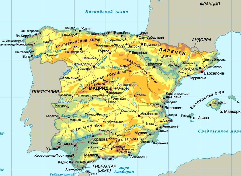3.Особенности рельефа.Полезные ископаемые страны.90% территории Испании занимают высокогорные плоскогорья и горные хребты,которые расположены практически равномерно по всей стране.Низменности расположены на юге страны,а на северо-востоке есть равнина (Арагонская).В среднем,вся территория расположена на высоте 700 метров выше уровня моря.Самая высокая точка это вулкан Тейде 3718 метров,который находится на острове Тенерифе.Из полезных ископаемых в Испании есть уголь,уран,вольфрам,железо,олово,медь,ртуть,свинец,флюорит,известняк.
