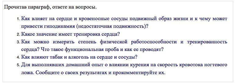 3. Чтобы узнать тренированность сердца человека делают функциональную пробу. Ее делают так: 1)Измеряют пульс в состоянии покоя. Нужно сделать 4 измерения за 10 секунд и среднее значение умножить на 6.2) Сделать 20 приседаний в быстром темпе и опять измерить ЧСС. Если ЧСС после приседаний повысилось на 1/3, результаты хорошие, если наполовину - результаты средние, а если больше чем наполовину - неудовлетворительные.