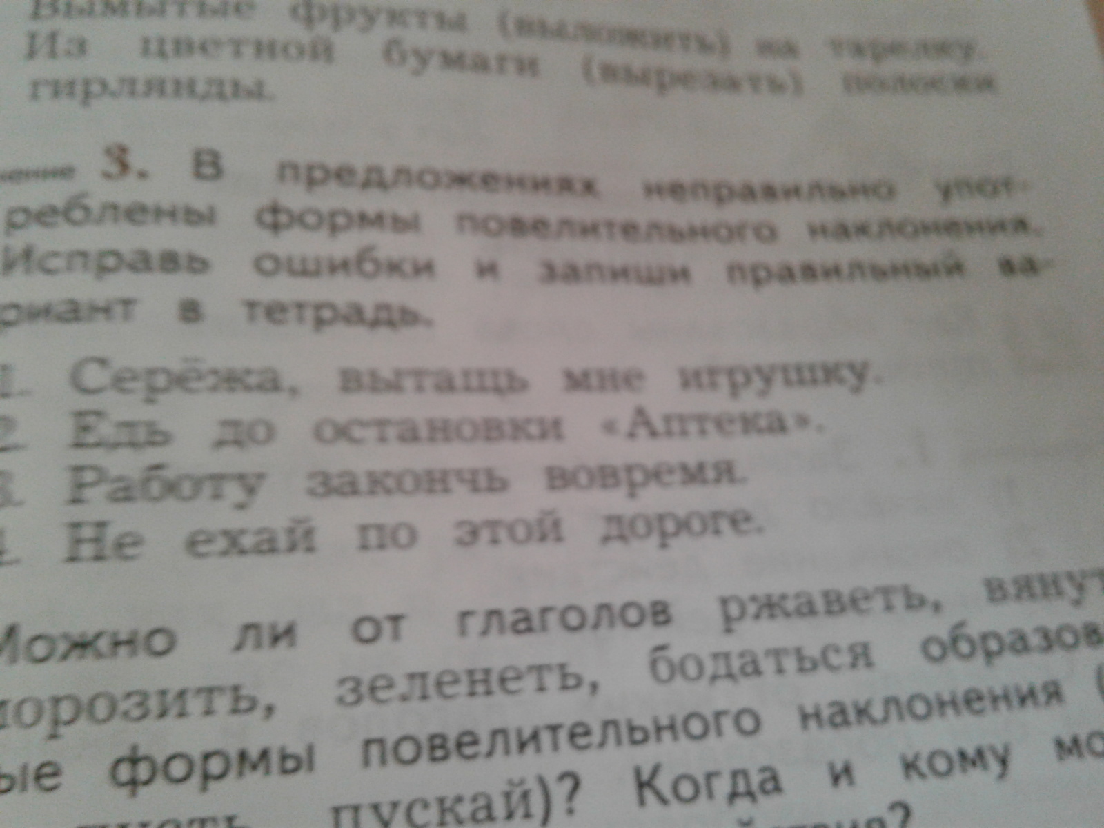 В предложениях неправильно употреблены формы повелительного наклонения . Исправь ошибки и запиши правильный вариант в тетрадь .